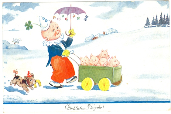 Neujahr, Junge als Clown, Glücksschweine, um 1920/30, rückseitig beschriftet, nicht postalisch gelaufen, gering eckbestossen, nur kleine Altersspuren.