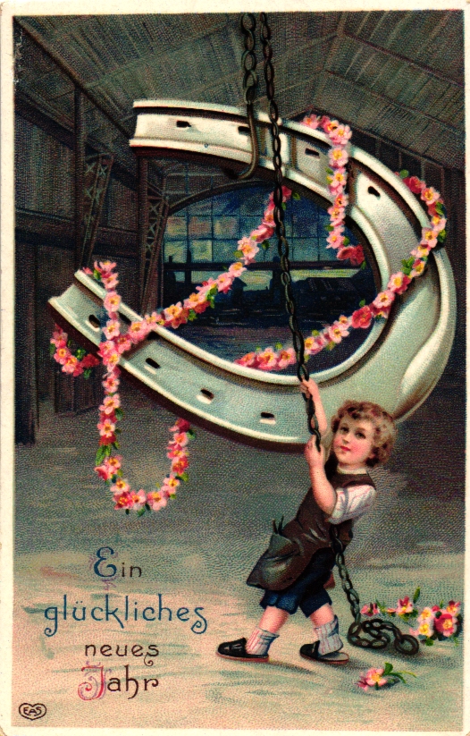 Neujahr, Kind mit großem Hufeisen, 1912 postalisch gelaufen, kleiner Randbug oben links, gering eckbestossen, sonst ordentliche Erhaltung.