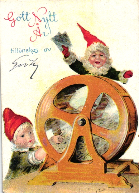 Neujahr, Kinder mit Lostrommel, schwedische Mini-AK, Format ca. 10,5×7,5cm, 1917 postalisch gelaufen, Briefmarke entfernt, mit rückseitig aufgeklebter Spendenmarke, hübsche Karte, Minikarten sind nicht häufig !