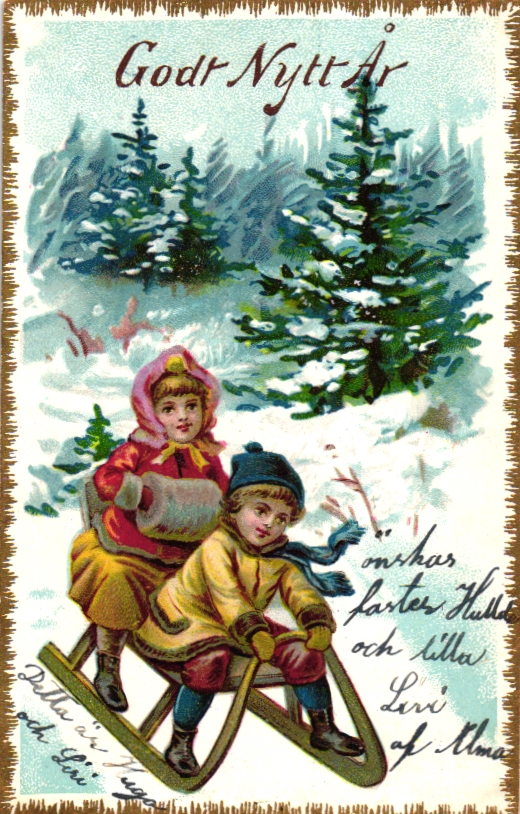 Neujahr, Kinder mit Schlitten, um 1900/05 nach Norsköpping in Schweden adressiert, beschriftet, nicht postalisch gelaufen, schöne Farb-Litho in einwandfreier Erhaltung.