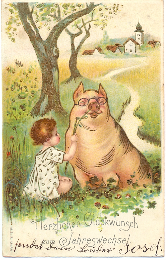 Neujahr, Mädchen mit Schwein, Prägekarte, 1904 postalisch gelaufen, schöne Karte mit nur sehr geringen Altersspuren, rückseitig gering fleckig.