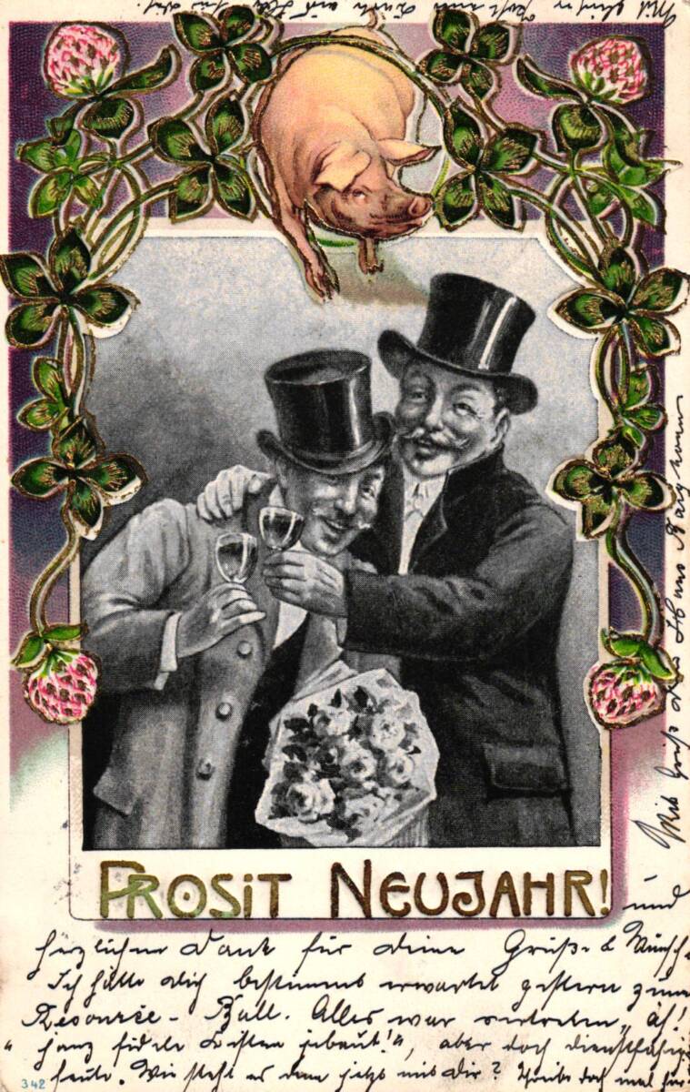 Neujahr, Männer mit Weinglas, Glücksschwein, 1903 postalisch gelaufen, minimal eckbestossen, sonst einwandfreie Erhaltung.