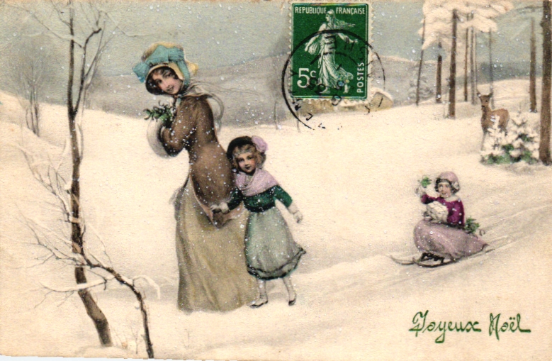 Neujahr, Mutter mit Kindern, Reh, Verlag V.K. Vienne, um 1910/20 postalisch gelaufen, Briefmarke vorderseitig, Eckbug oben links, sonst nur geringe Altersspuren.