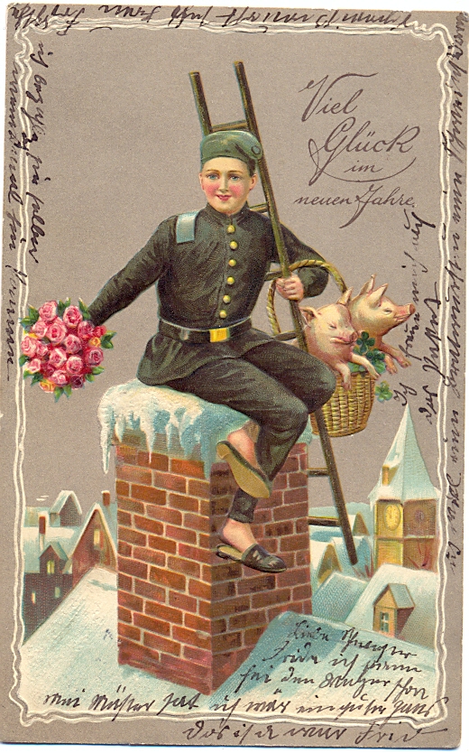 Neujahr, Schornsteinfeger, Schweine, Prägekarte, 1910 postalisch gelaufen, minimal eck- bzw. randbestossen, sonst einwandfreie Erhaltung.