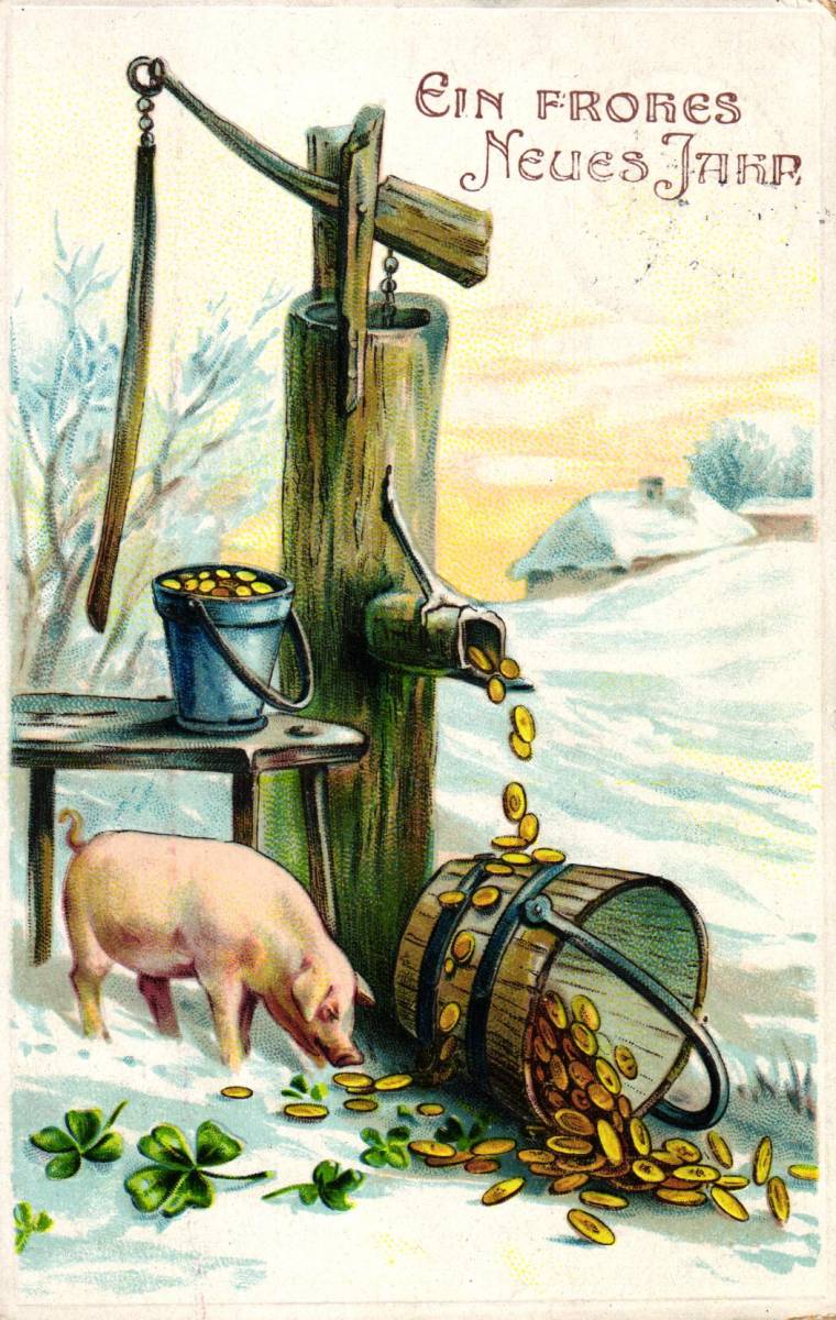 Neujahr, Schwein, Geldbrunnen, 1912 in Mülheim / Rhein versandt, leicht eckbestossen, sonst ordentliche Erhaltung.