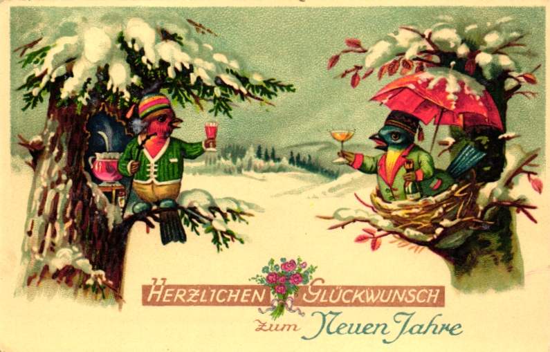 Neujahr, Vögel mit Getränken, 1935 postalisch gelaufen, Farb-Litho, hübsches Motiv, nur sehr kleine Altersspuren.