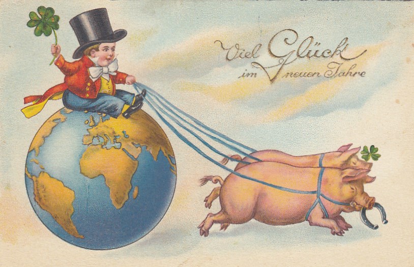 Neujahr, Weltkugel, Junge mit Schweinen, ca. 40er Jahre