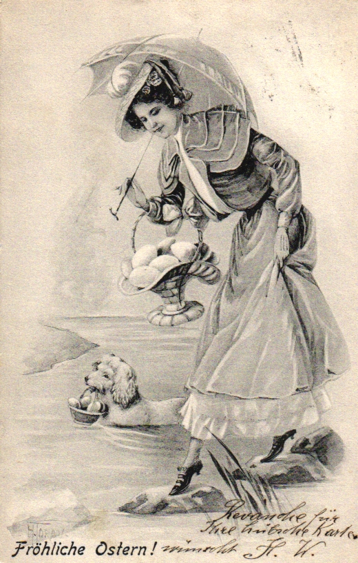 Ostern, Dame überquert mit Hund einen Fluss, Hund trägt einen Korb mit Eiern, sehr ungewöhnliches Motiv, 1905 postalisch gelaufen, gering Stempelspuren vorderseitig, nur sehr kleine Altersspuren.