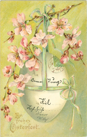 Ostern, großes Ei mit Blumen, Prägekarte, 1905 als Soldatenkarte von Frankfurt nach Kiel versandt, schöne Karte, unten rechts etwas größerer Eckbug, sonst nur geringe Altersspuren.
