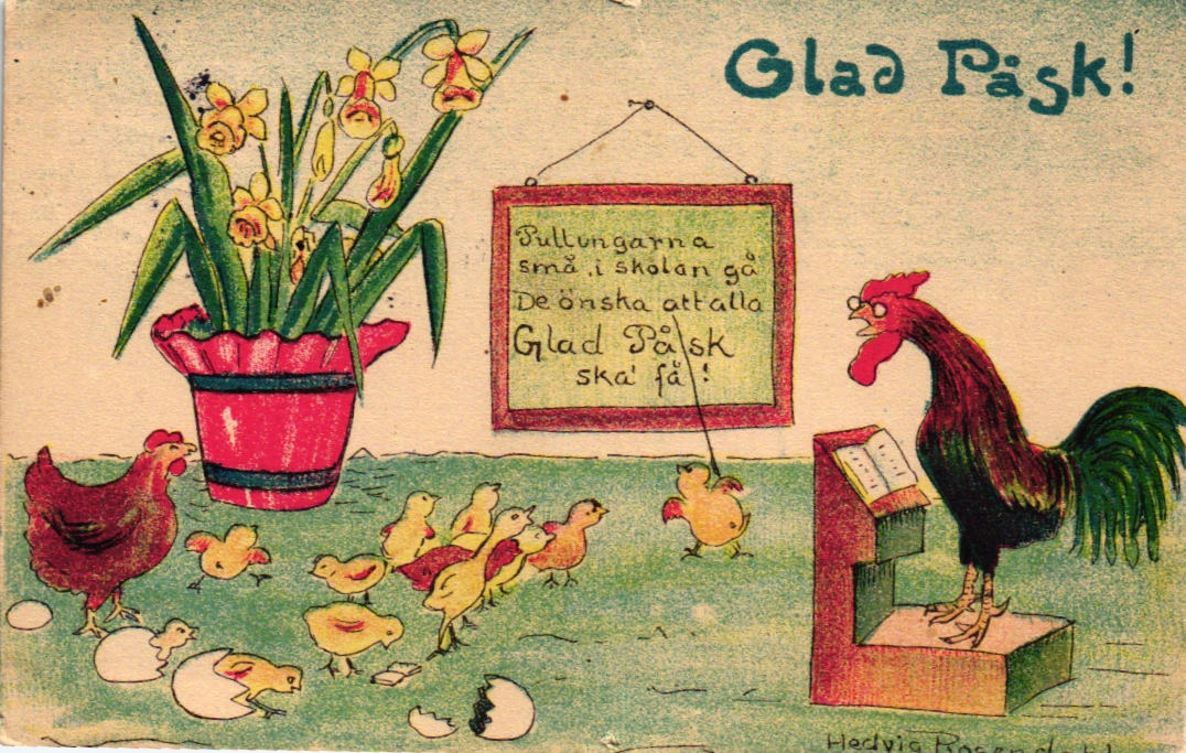 Ostern, Hahn als Lehrer, Schule, 1917 in Stockholm versandt, sign. Rosendahl, leichter Eckbug, gering eck- u. randbestossen, insgesamt aber noch ordentliche Erhaltung.