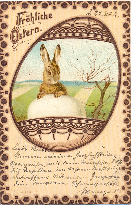 Ostern, Hase im großem Ei, 1902 postalisch gelaufen, nur sehr geringe Altersspuren.
