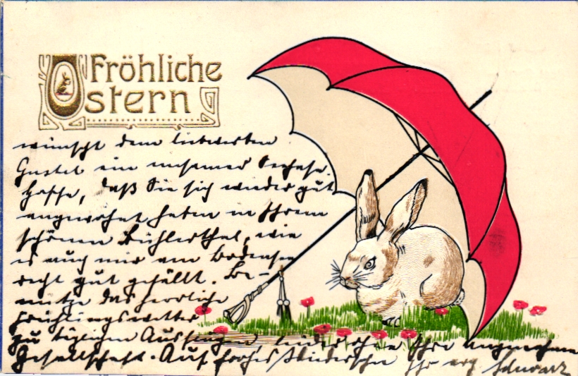Ostern, Hase mit Regenschirm, Prägekarte, 1906