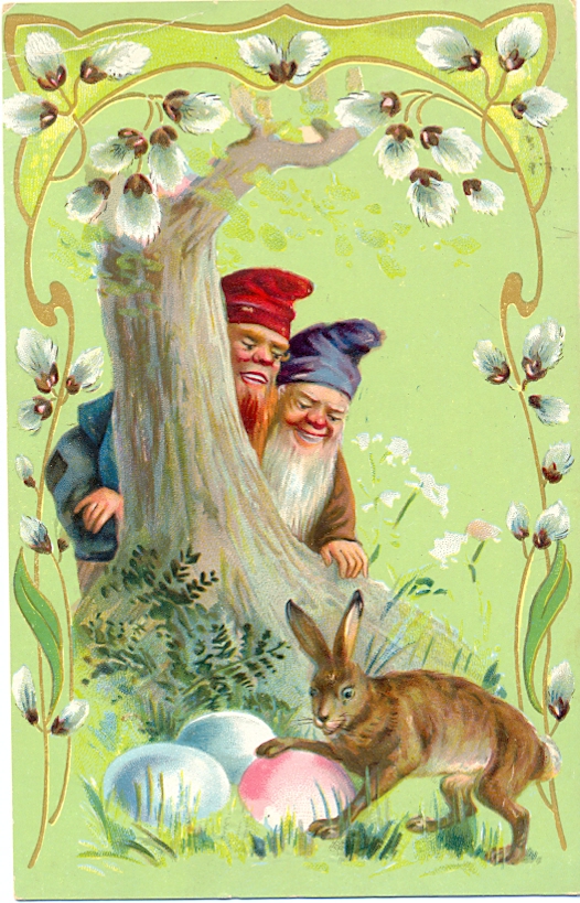 Ostern, Hase, Zwerge, Prägekarte, 1909 postalisch gelaufen, oben rechts etwas größerer Eckbug, sonst nur sehr kleine Altersspuren, ausgesprochen schöne Karte !