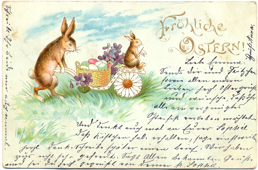 Ostern, Hasen, Farb-Litho, 1900 postalisch gelaufen, leichte Altersspuren, rechts unten Eckbug, insgesamt aber noch ordentliche Erhaltung.