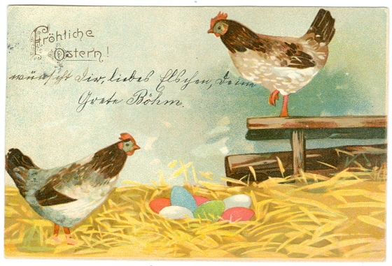 Ostern, Hühner, Eier, 1906 postalisch gelaufen, Farb-Litho, kleine Altersspuren, etwas Stempelspuren vorderseitig.
