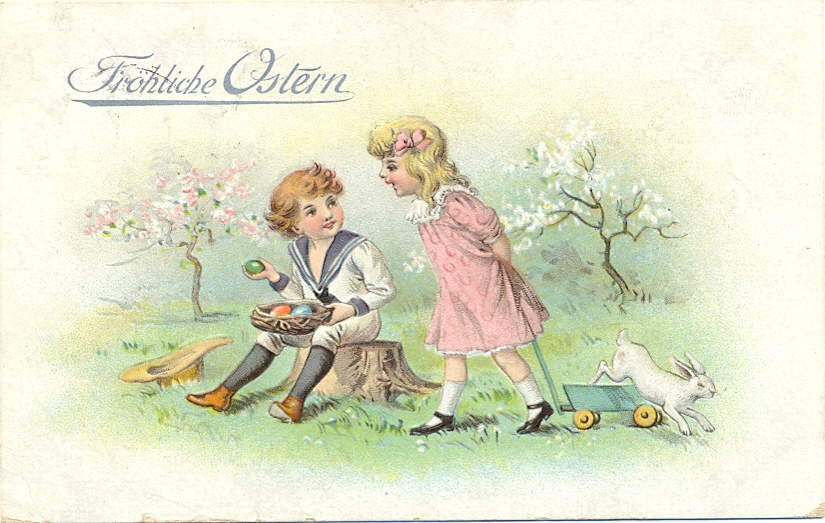 Ostern, Kinder, Hase, Prägekarte, 1912 postalisch gelaufen, etwas eck- u. randbestossen, kleiner Eckbug, sonst ordentliche Erhaltung.