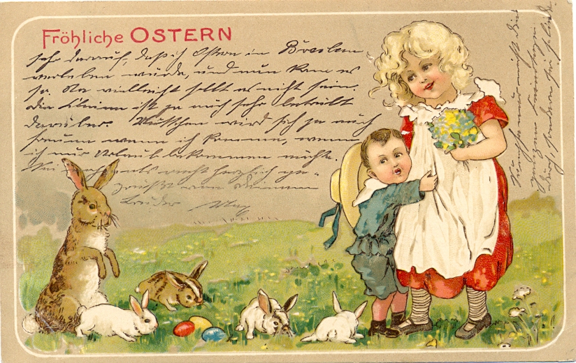 Ostern, Kinder, Hasen, Farb-Litho, 1908 postalisch gelaufen, unten rechts fast nicht sichtbarer Eckbugansatz, schöne Karte mit nur sehr geringen Altersspuren.