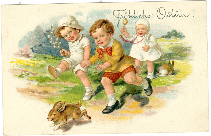 Ostern, Kinder, Hasen, um 1920/30 postalisch gelaufen, nur kleine Altersspuren.