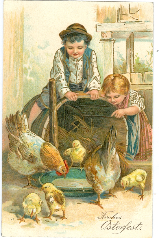 Ostern, Kinder, Hühner, Küken, Prägekarte, 1910 postalisch gelaufen, schöne Karte in guter Erhaltung.
