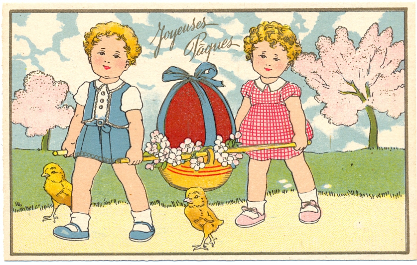 Ostern, Kinder mit großem Ei, Farb-Litho, um 1920, nicht beschriftet, nicht gelaufen, sehr gute Erhaltung.