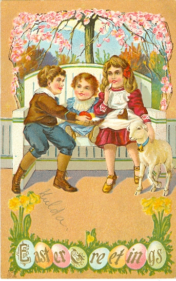 Ostern, Kinder mit Lamm, Prägekarte, um 1910, rückseitig beschriftet, nicht postalisch gelaufen, schöne Karte, minimal eckbestossen, sonst einwandfreie Erhaltung.