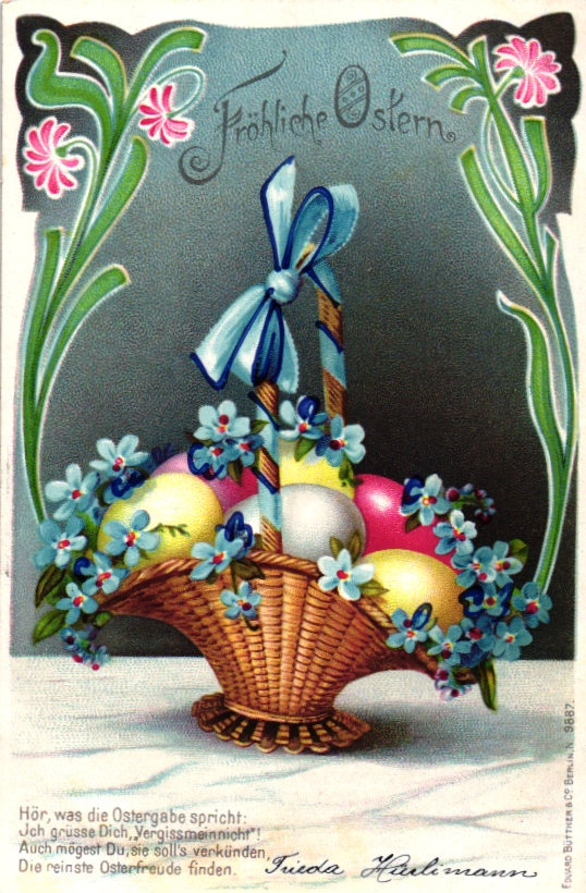 Ostern, Korb mit Eiern, Jugendstil AK, um 1900/05, beschriftet, nicht postalisch gelaufen, sehr schöne Karte, am Unterrand leicht fleckig, sonst gute Erhaltung.