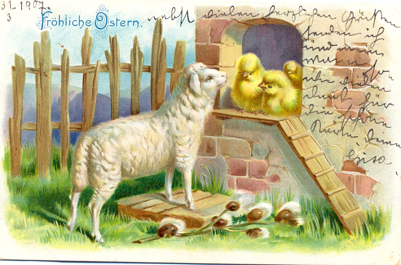 Ostern, Lamm, Küken, Prägekarte, 1907, leicht eckbestossen, kleiner Eckbug, sonst noch ordentliche Erhaltung.