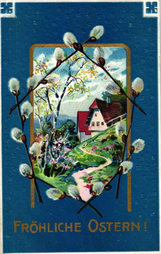Ostern, Landschaft, Palmkätzchen, Prägekarte, 1908 postalisch gelaufen, nur winzige Altersspuren.