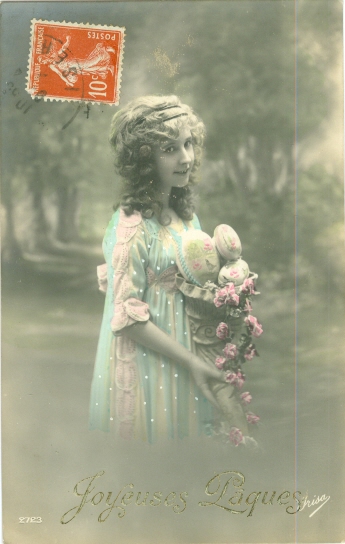 Ostern, Mädchen, Eier, Blumen, um 1910 postalisch gelaufen, Briefmarke vorderseitig, nur geringe Altersspuren.