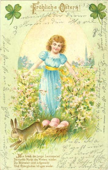 Ostern, Mädchen, Hase, Eier, Farb-Litho, Prägekarte, 1903 postalisch gelaufen, unten rechts kleiner Eckbug, leichter Bug oben Mitte, kleine Altersspuren.