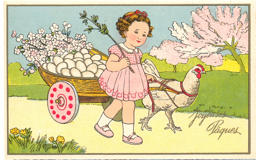 Ostern, Mädchen, Huhn, Wagen mit Eiern, um 1920