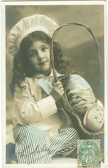 Ostern, Mädchen, Korb, Eier, 1907 nach Paris versandt, unten links größerer Eckbug, insgesamt aber ordentliche Erhaltung.