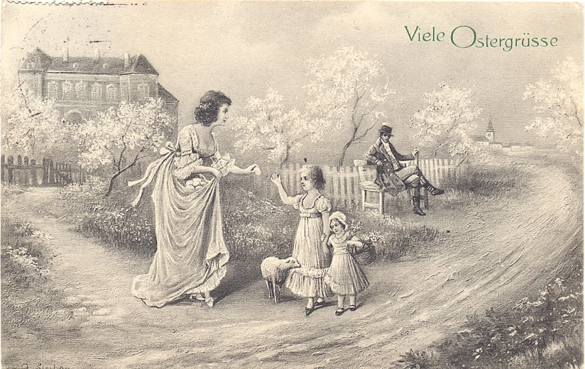 Ostern, Mutter mit Kindern, 1913 postalisch gelaufen, Briefmarke oben links etwas über den Rand geklebt, nur sehr kleine Altersspuren.
