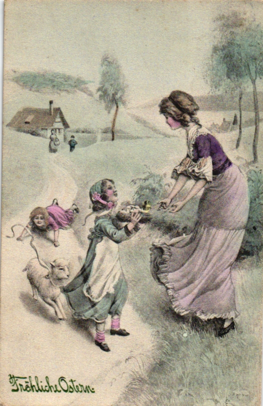 Ostern, Mutter mit Kindern, 1913 postalisch gelaufen, Verlag V.K. Vienne Nr. 4159, leichte Altersspuren, gering fleckig, jedoch sammelwürdige Erhaltung.