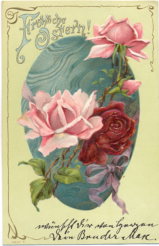 Ostern, Rosen, großes Ei, Prägekarte, um 1900/05, nur vorderseitig etwas beschriftet, nicht postalisch gelaufen, schöne Karte, winzigster Eckbug, sonst gute Erhaltung.