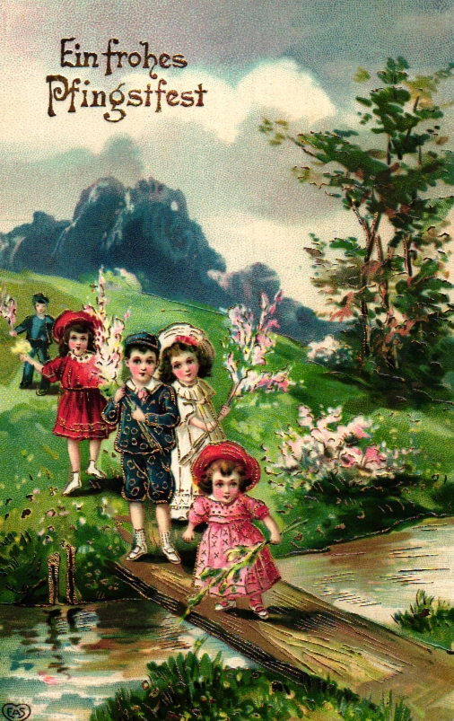 Pfingsten, Kinder, Fluss, Brücke, 1910 postalisch gelaufen, hübsche Karte mit leichter Prägung, gute Erhaltung.