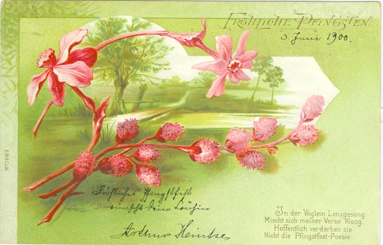 Pfingsten, Landschaft, Klee, Blumen, Farb-Litho, 1900 postalisch gelaufen, leicht eckbestossen, rückseitig Anklebestellen aus der ehemaligen Albumbefestigung.