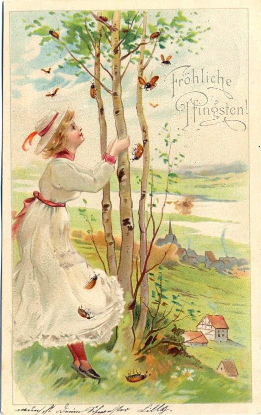 Pfingsten, Mädchen, Baum mit Maikäfern, 1901 postalisch gelaufen, sehr schöne Karte, lediglich oben links schwacher Randbug.