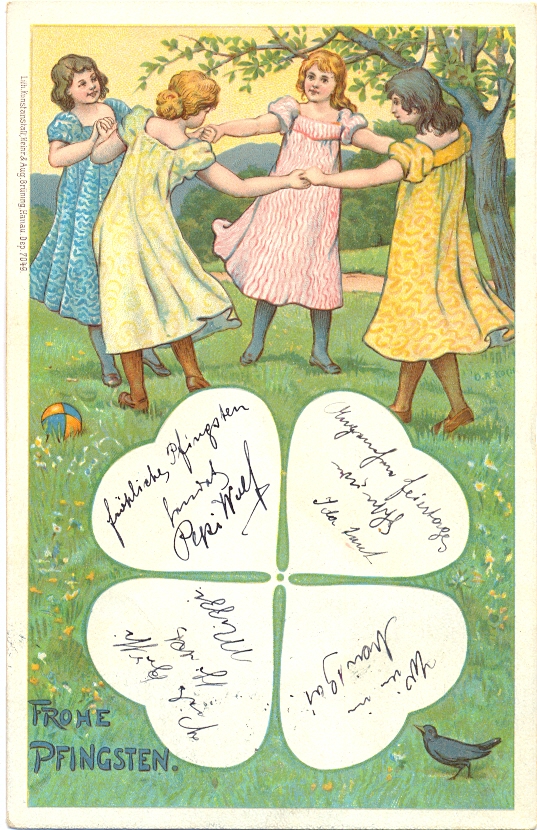 Pfingsten, Mädchen, Tanz, Farb-Litho, 1901 postalisch gelaufen, einwandfreie Erhaltung.