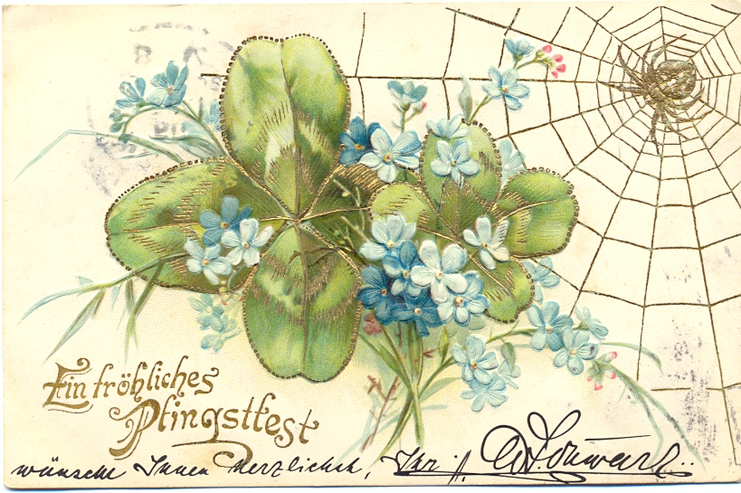 Pfingsten, Spinnen Prägekarte, 1902 postalisch gelaufen, gering Stempelspuren vorderseitig, nur kleinere Altersspuren.