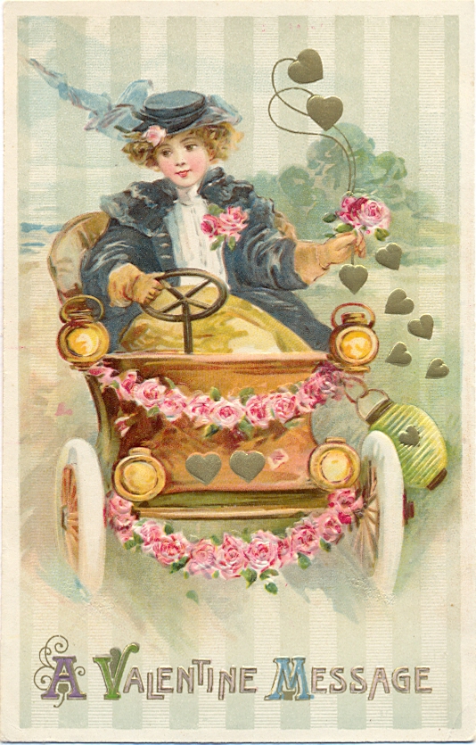 Valentinstag, Dame im Automobil, Prägekarte, um 1910, rückseitig beschriftet, nicht postalisch gelaufen, sehr kleiner Eckbug unten rechts, sonst einwandfreie Erhaltung.