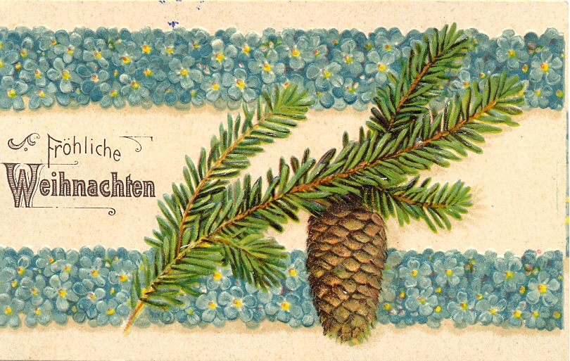Weihnachten, Blumen, Tannenzapfen, Prägekarte, um 1910, nicht beschriftet, nicht gelaufen, oben links gering Tintenspuren, sonst ordentliche Erhaltung.
