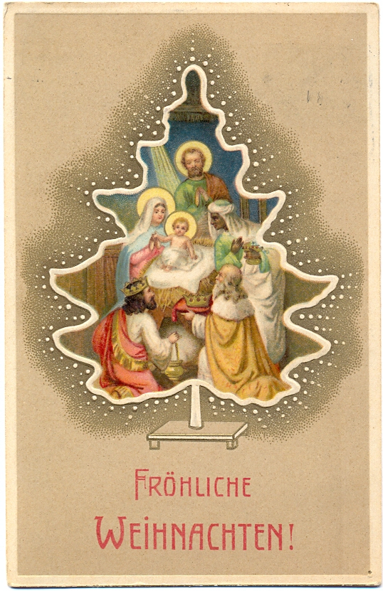 Weihnachten, Christbaum, Krippe, Prägekarte, 1910 postalisch gelaufen, kleinere Altersspuren.