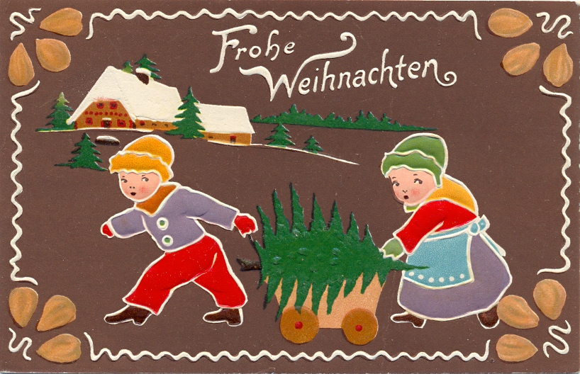 Weihnachten, Kinder m. Christbaum, Lebkuchen Prägekarte, um 1910, nicht beschriftet, nicht gelaufen, besonders schöne Karte dieses beliebten Sammelgebietes, gute Erhaltung.