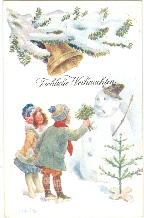 Weihnachten, Kinder mit Schneemann, sign., 1907