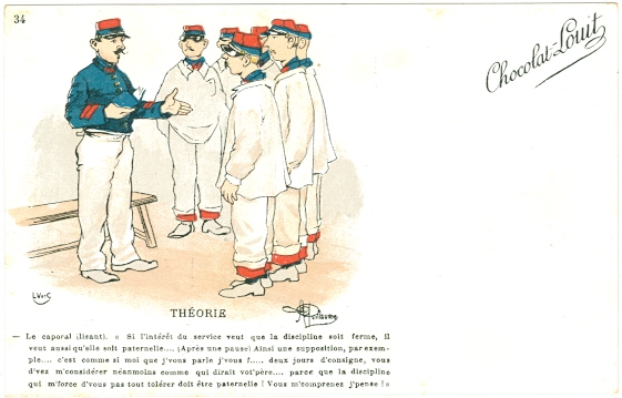 Französische Soldaten, „Theorie“, sign. Guillaume, nicht beschriftet, nicht gelaufen, mit Werbeeindruck „Chocolat-Louit“, vorder- u. rückseitig gering fleckig, sonst ordentliche Erhaltung.