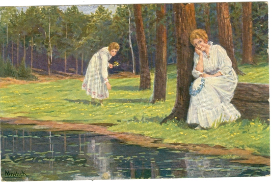 Frauen, Wiese, Blumen, sign. Mailick, 1917 als Feldpostkarte gelaufen, etwas eck- u. randbestossen, sonst ordentliche Erhaltung.