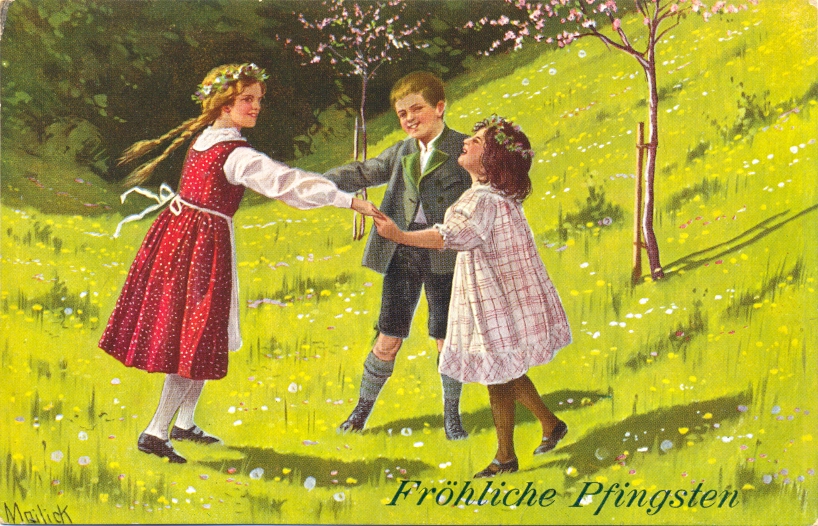 Pfingsten, tanzende Kinder, um 1915, sign. Mailick, nicht beschriftet, nicht gelaufen, leicht eckbestossen (oben links etwas stärker), sonst einwandfreie Erhaltung.