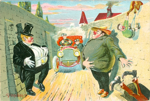 Enge Strasse, Dicke Männer, sign. Antonio Donadini, Farb-Litho, 1907 postalisch gelaufen, leicht eck- u. randbestossen, schöne AK !