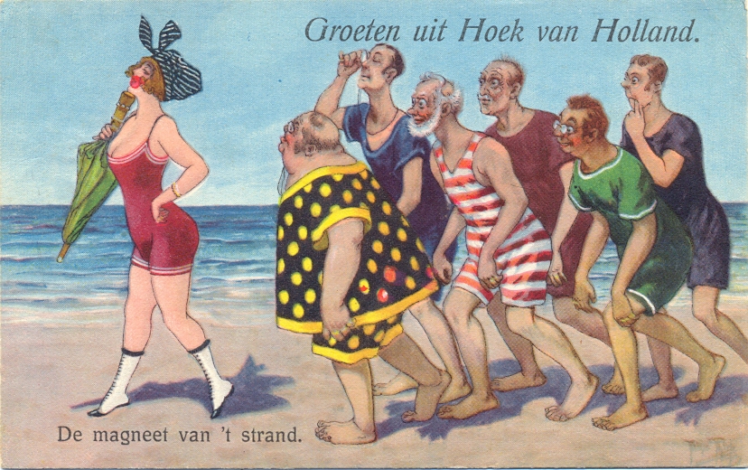 Hübsche Dame, verfolgt von Männern, „Der Strandmagnet“, sign. Arthur Thiele, 1930 postalisch gelaufen, kleiner Eckbug oben rechts, vorderseitig kaum sichtbar, sonst nur geringe Altersspuren.